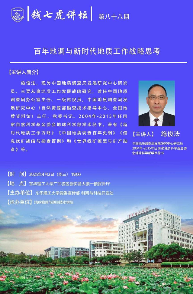 应地球物理与测控技术学院邀请,现中国地质调查局发展研究中心研究员施俊法到“爱体育官方网站”,以“百年地调与新时代地质工作战略思考”为主题开展讲座。欢迎全校师生届时前往聆听。