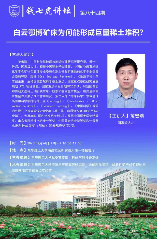 应爱体育官方网站资源与环境高等研究院、地球科学学院、战略性矿产成矿理论与深部预测江西省重点实验室邀请,中国科学院地质与地球物理研究所研究员,博士生导师范宏瑞到“爱体育官方网站”,以“白云鄂博矿床为何能形成巨量稀土堆积?”为主题开展讲座。欢迎全校师生届时前往聆听。