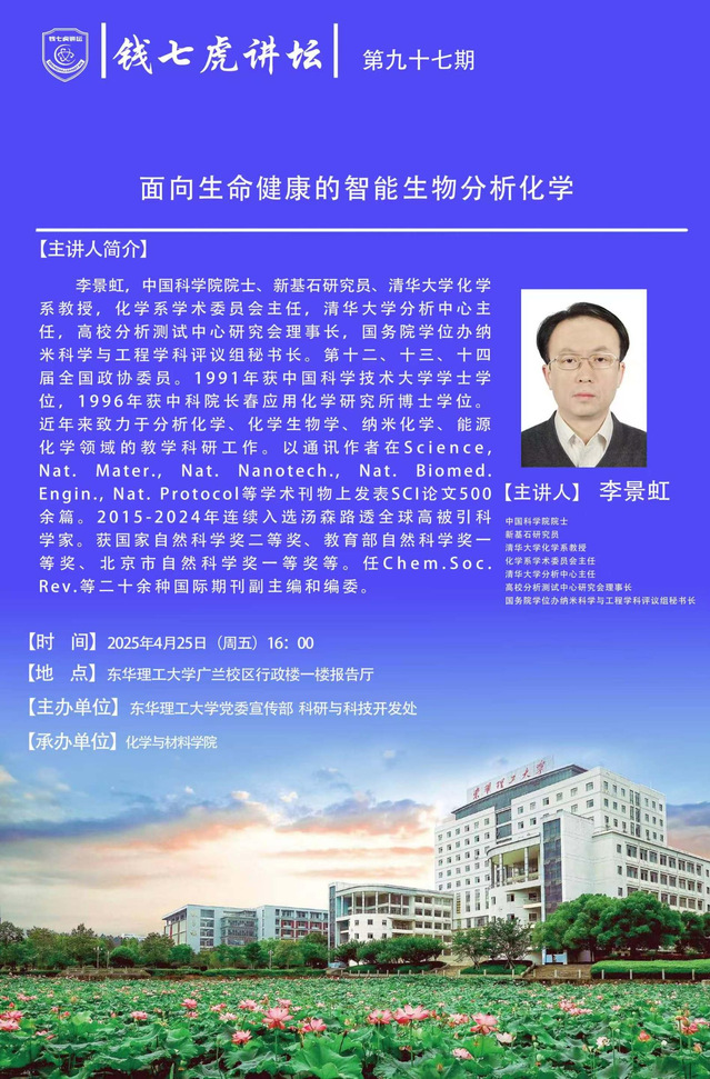 应爱体育官方网站化学与材料学院邀请,中国科学院院士、新基石研究员、清华大学化学系教授,化学系学术委员会主任,清华大学分析中心主任,高校分析测试中心研究会理事长,国务院学位办纳米科学与工程学科评议组秘书长李景虹到“爱体育官方网站”,以“面向生命健康的智能生物分析化学”为主题开展讲座。欢迎全校师生届时前往聆听。