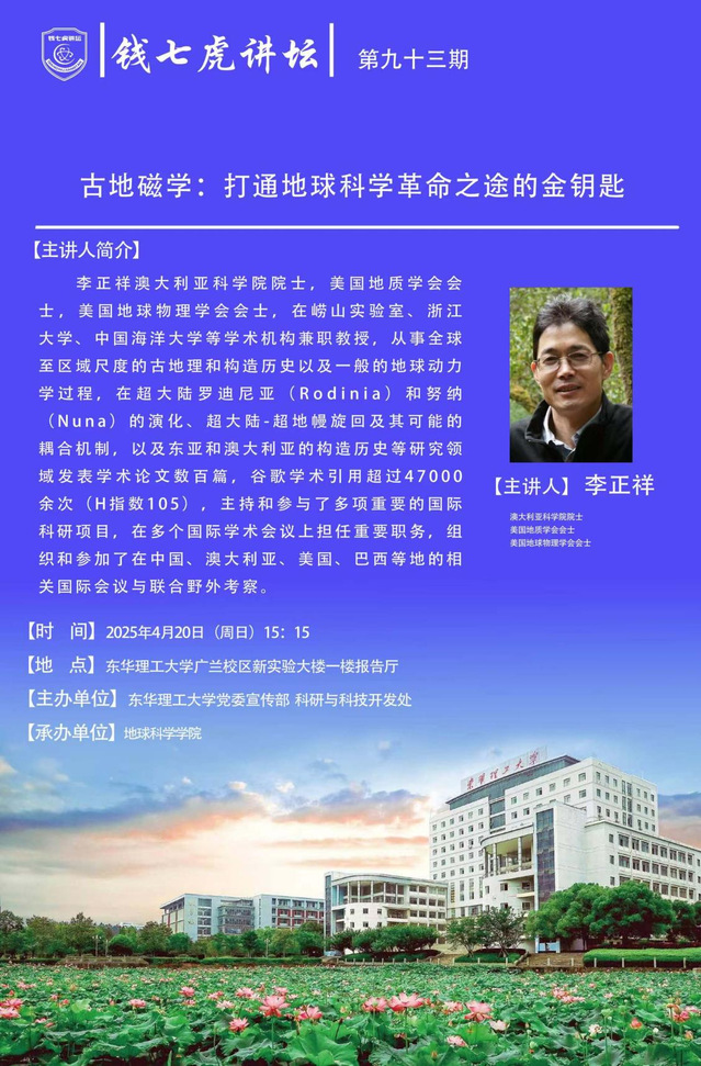 应地球科学学院邀请,澳大利亚科学院院士,美国地质学会会士,美国地球物理学会会士李正祥到“爱体育官方网站”以“古地磁学:打通地球科学革命之途的金钥匙”为主题开展讲座。欢迎全校师生届时前往聆听。