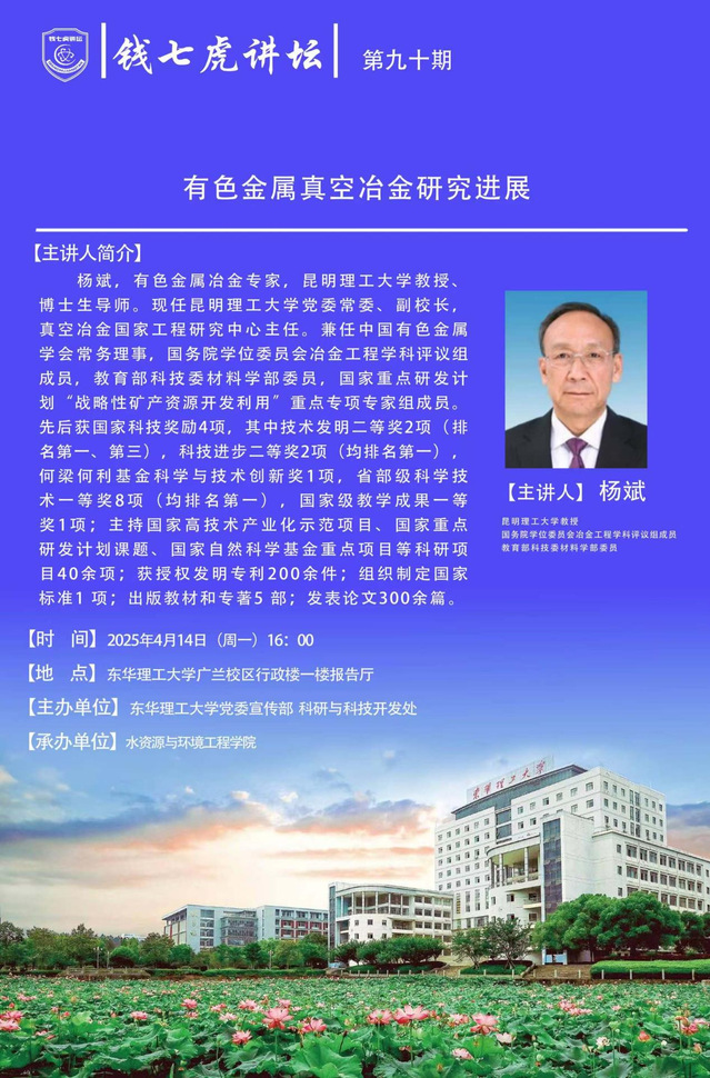 应水资源与环境工程学院邀请,昆明理工大学教授、博士生导师杨斌到“爱体育官方网站”以“有色金属真空冶金研究进展”为主题开展讲座。欢迎全校师生届时前往聆听。